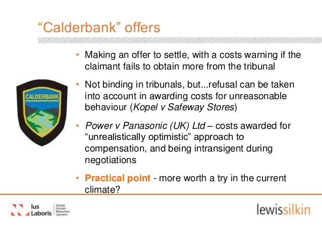 The Calderbank letter does not need to follow any particular structure or layout; the Courts can consider any offer in writing in deciding the reasonableness of the parties in their willingness to settle and general approach. (a) The Supreme Court, in considering the awarding of the costs of any appeal or any application in respect of an appeal, may, where it considers it just, have regard to the terms of any offer in writing sent by any party to any other party or parties offering to satisfy the whole or part of that other party’s (or those other parties’) claim or counterclaim the subject of the appeal, or application. (b) The High Court, in considering the awarding of the costs of any action (other than an action in respect of a claim or counterclaim concerning which a lodgment or tender offer in lieu of lodgment may be made in accordance with ) or any application in such an action, may, where it considers it just, have regard to the terms of any offer in writing sent by any party to any other party or parties offering to satisfy the whole or part of that other party’s (or those other parties’) claim, counterclaim or application. (c) The High Court, in considering the awarding of the costs of any appeal from the Circuit Court, may, where it considers it just, have regard to the terms of any offer in writing sent by any party to any other party to the appeal offering to satisfy the whole or part of that other party’s (or those other parties’) claim or counterclaim the subject of the appeal. () Unlike with a lodgment the time allowed to serve a Calderbank letter is open, and can be done so right up to trial. The differences between Calderbank letters and lodgments So, the significant differences between a Calderbank letter and a lodgment revolve around • Timing-when they can be used, and • The degree of discretion the Courts have in relation to penalising a party, as to costs, who will not settle or is unreasonable-wide in relation to Calderbank letters, none in relation to lodgements which are not exceeded by the plaintiff’s subsequent award, if any.
